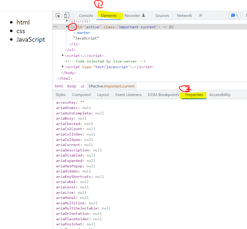- Properties - 선택된 엘레멘츠가 돔에대한 어떤 속성을 가지고 있는지 나타냄
