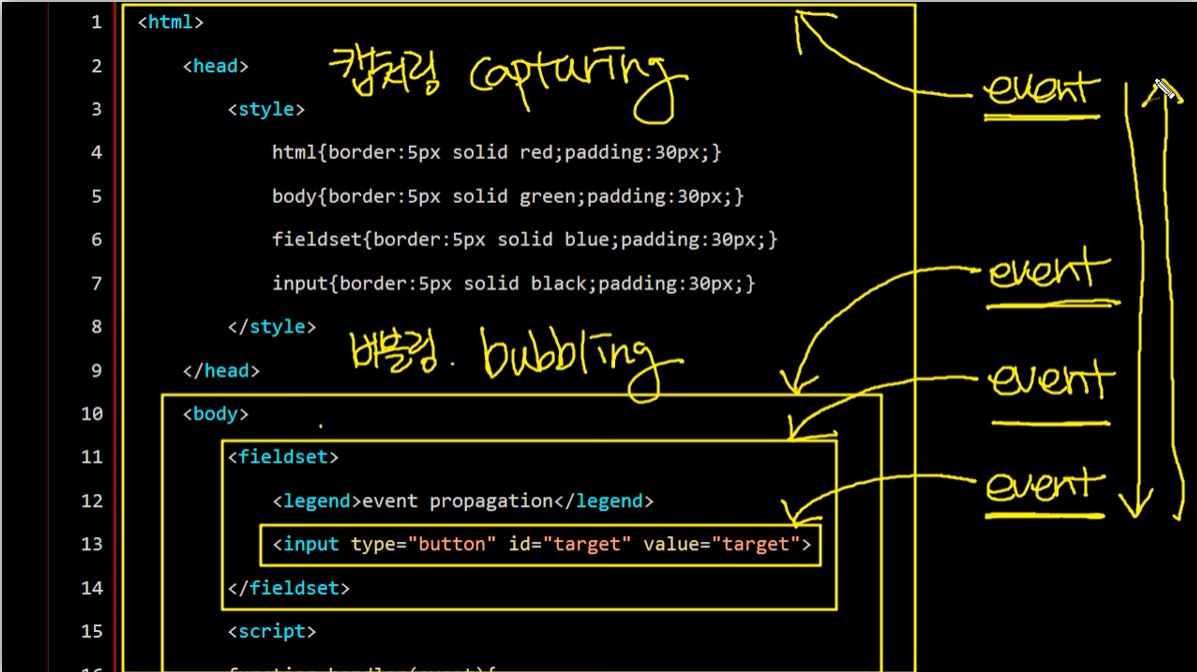 - 캡처링 <-> 버블링 두 개념 사이에는 이벤트가 전달되는 흐름에 차이가 있음