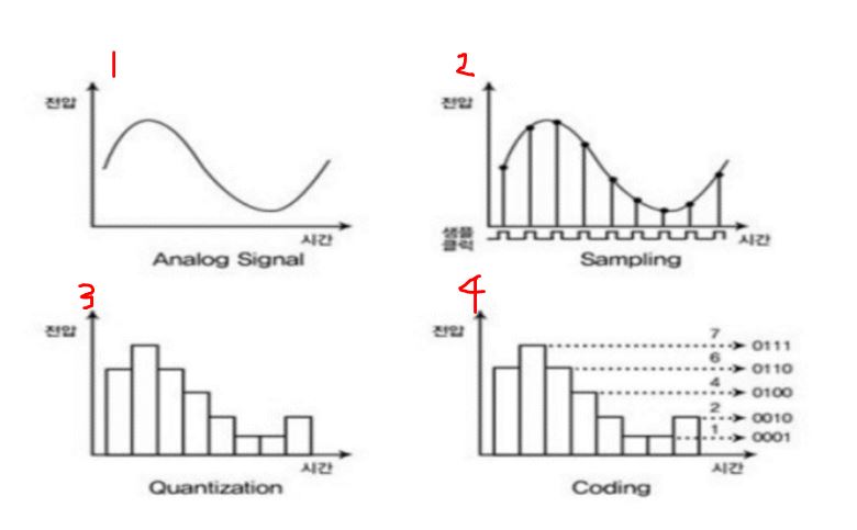 - 부호화(Coding : 아날로그 신호의 근사치를 이진수의 형태로 회로가 읽고 저장할 수 있도록 변환하는 것