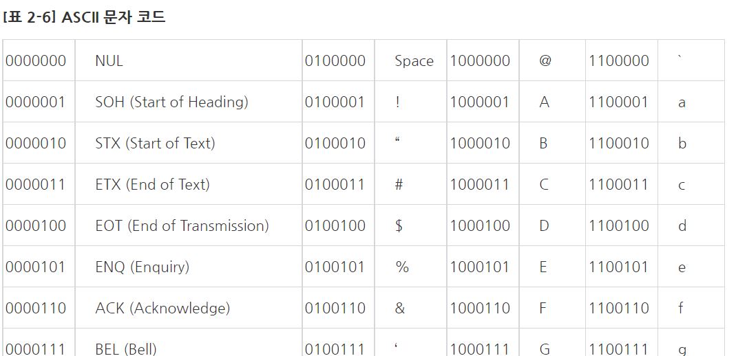 -각 문자를 7비트로 표현하므로 총 128(= 27)개의 문자를 표현할 수 있다.